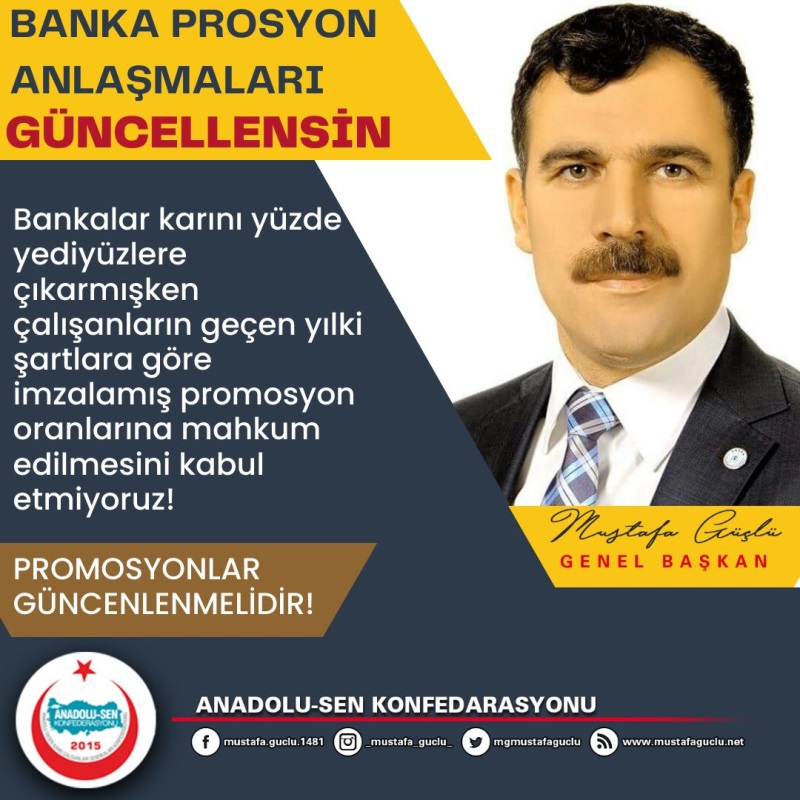 Bankalar karını yüzde yediyüzlere çıkarmışken çalışanların geçen yılki şartlara göre imzalamış promosyon oranlarına mahkum edilmesini asla kabul etmiyoruz! PROMOSYONLAR GÜNCENLENMELİDİR! MUSTAFA GÜÇLÜ AANOLU SEN GENEL BAŞKANI